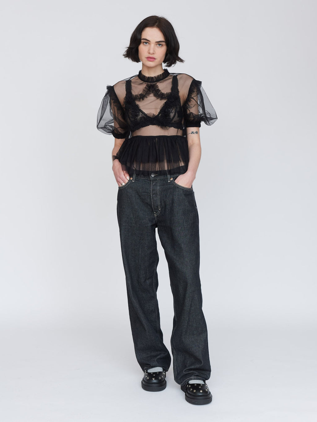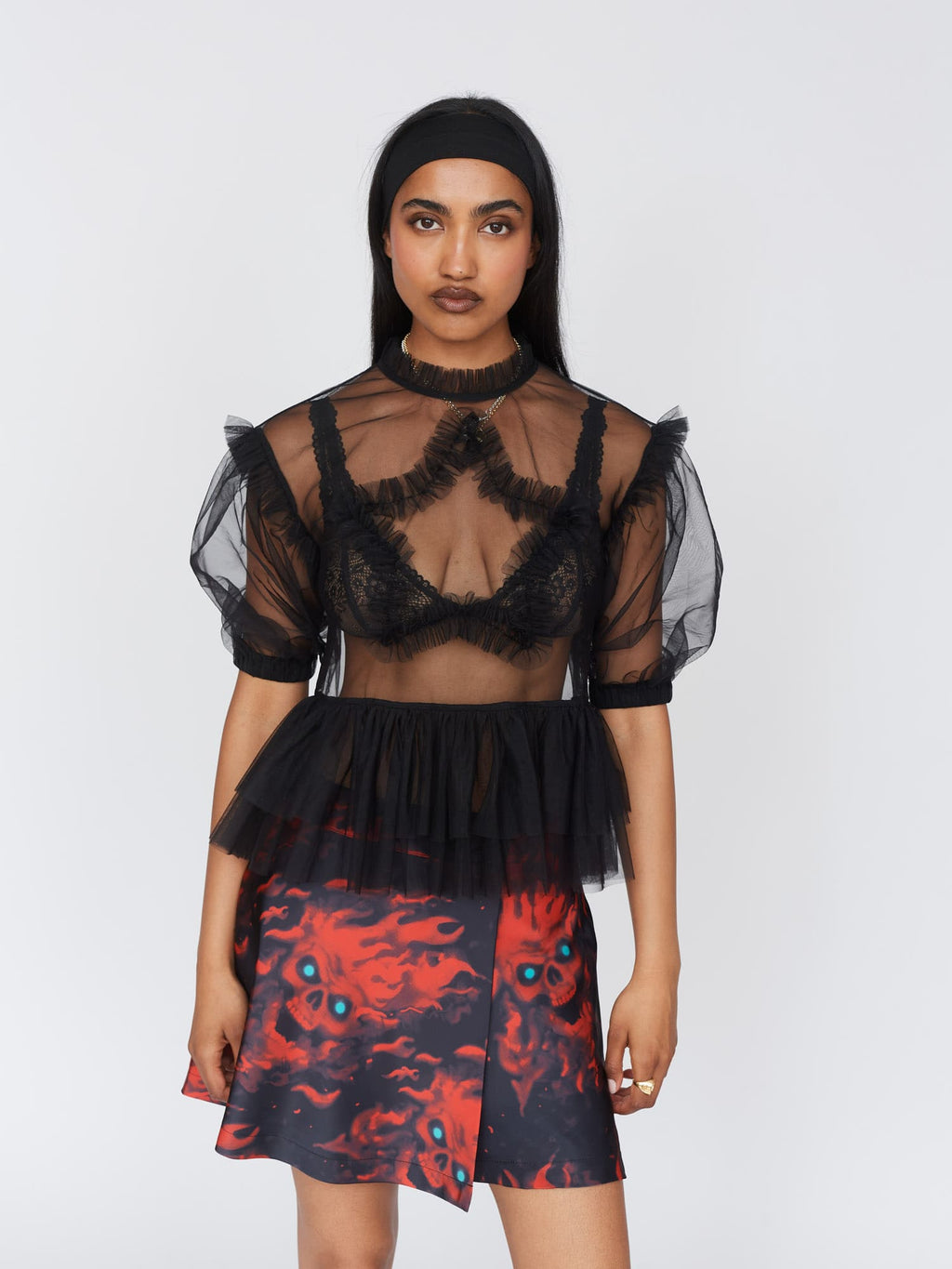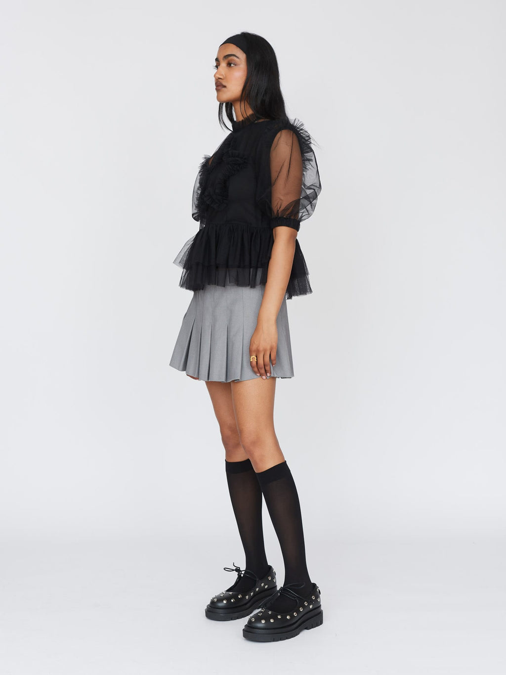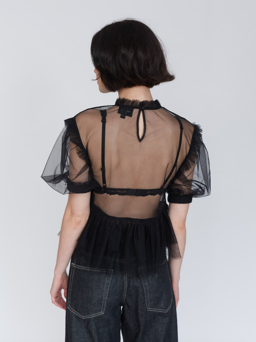 Sheer black tulle top. Puff sleeves with elasticated cuffs. Applique ruffle star detail at chest. Ruffle detail at neck, shoulder, and waist peplum. Back neck keyhole closure.