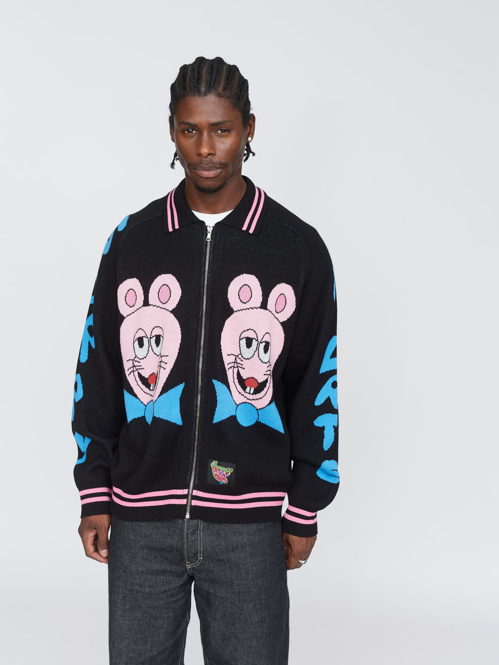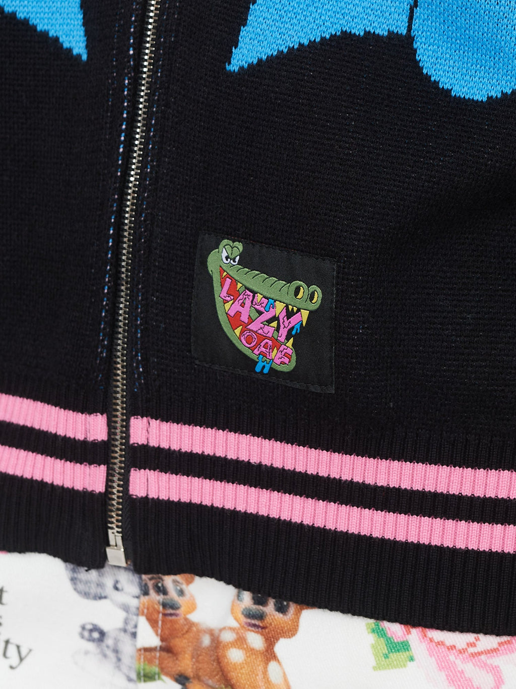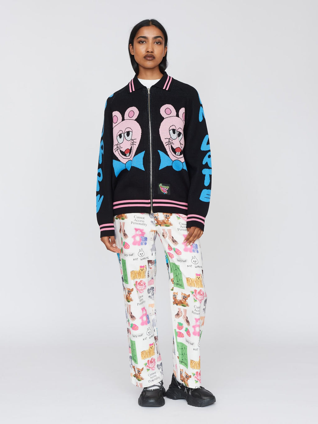 This black knit, zip up cardigan has a ribbed collar, cuffs and hem with pink tipping stripes and raglan sleeves. On the front, back and sleeves are intarsia designs by artist Horriblparty Studios, then at the hem is a custom woven Lazy Oaf patch. This’ll make a perfect ‘fit paired with our Sorry I’m Late Fitted Tee and your favourite relaxed jeans.