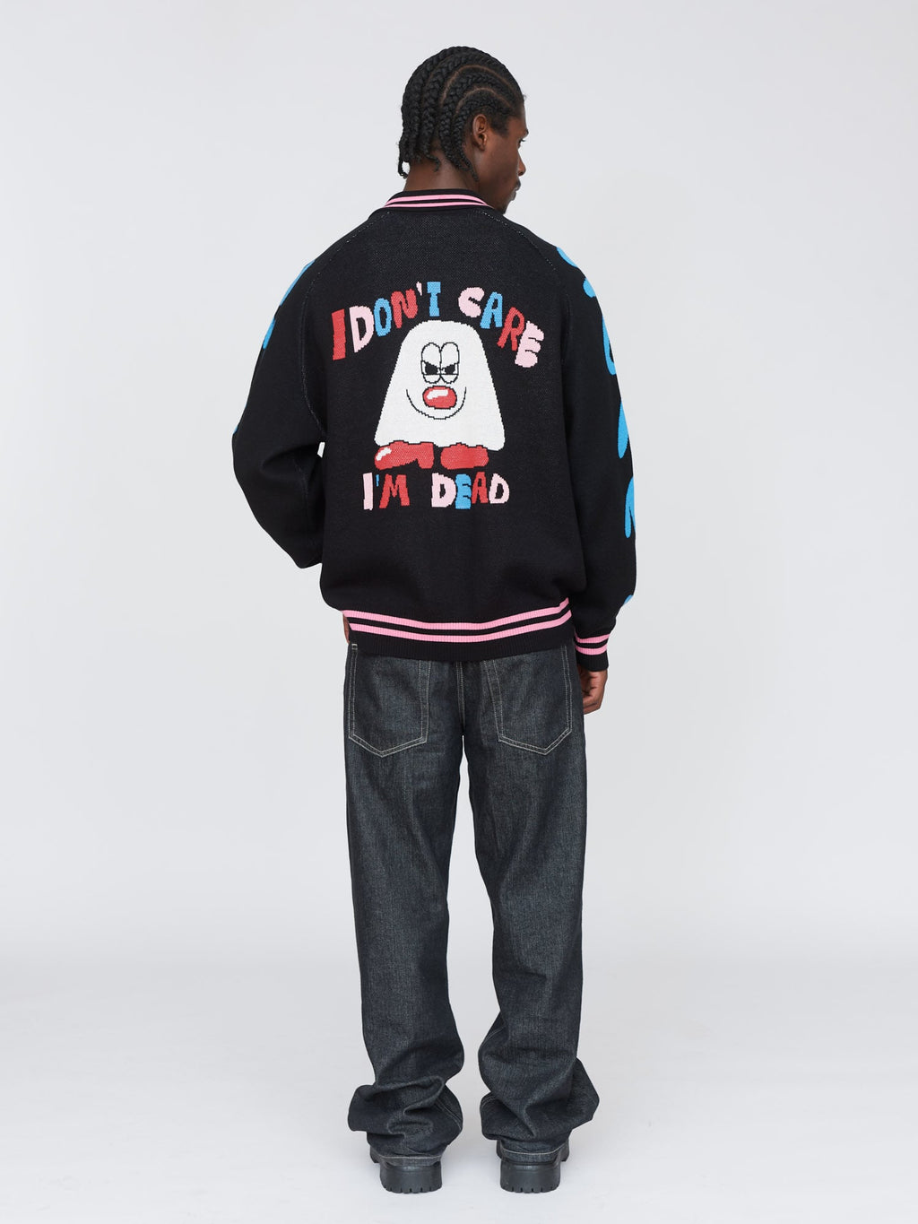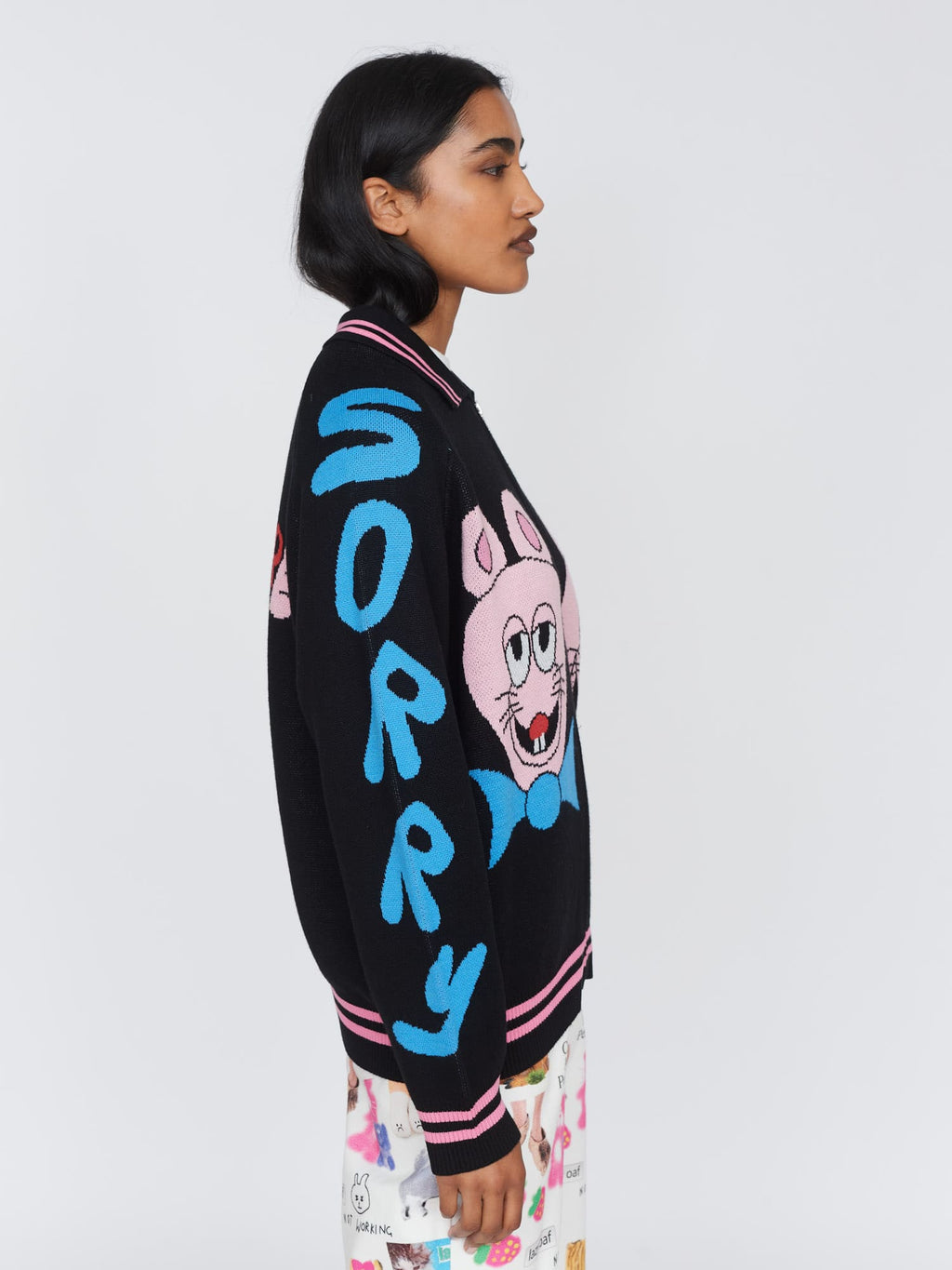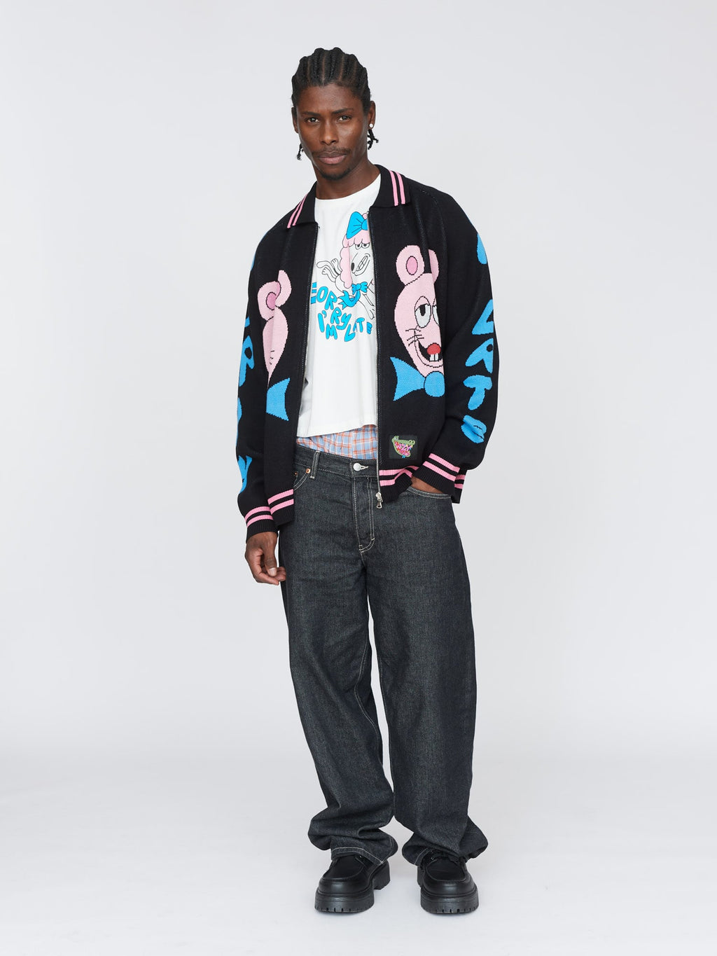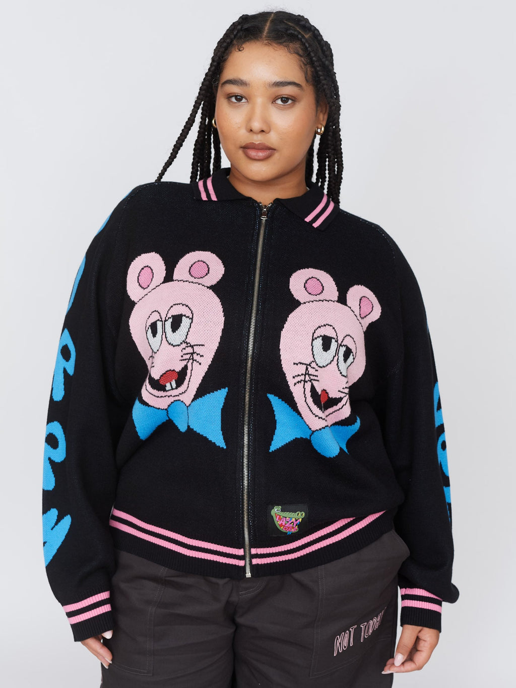 This black knit, zip up cardigan has a ribbed collar, cuffs and hem with pink tipping stripes and raglan sleeves. On the front, back and sleeves are intarsia designs by artist Horriblparty Studios, then at the hem is a custom woven Lazy Oaf patch. This’ll make a perfect ‘fit paired with our Sorry I’m Late Fitted Tee and your favourite relaxed jeans.