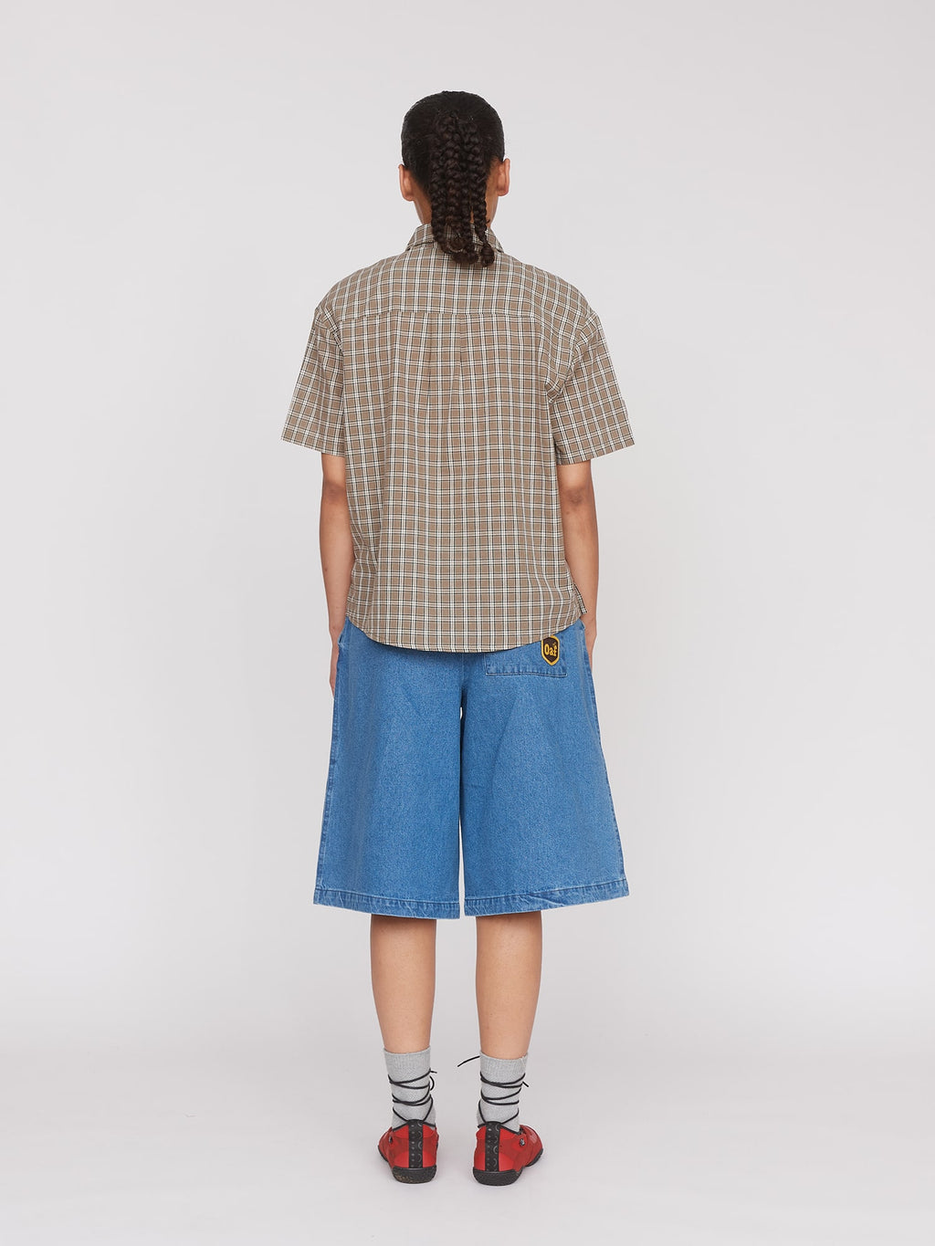 In a mixed colour check, this cotton blend shirt is short sleeved and has a relaxed, true to size fit. There’s a back yoke with box pleat detail and there are side slits at the hem, all of these details give the shirt its effortlessly good fit. For all your important letters, there’s a chest patch pocket and across the shirt are woven patches and embroidered details by illustrator, Tom Bingham. Mix ‘N’ match your checks by pairing it with our Checked Out Skirt, or keep it simple with our You’ve Got Mail Jorts.