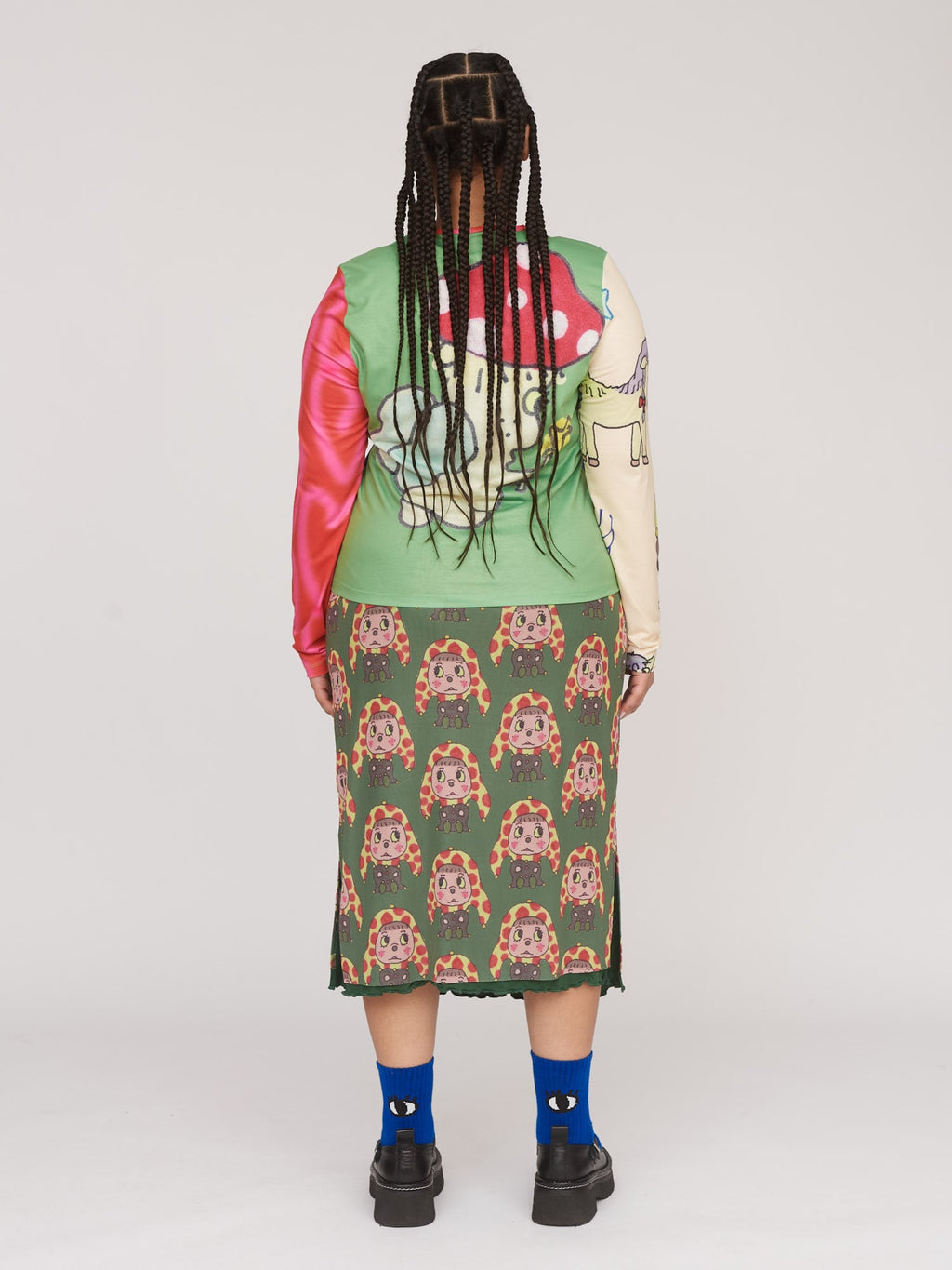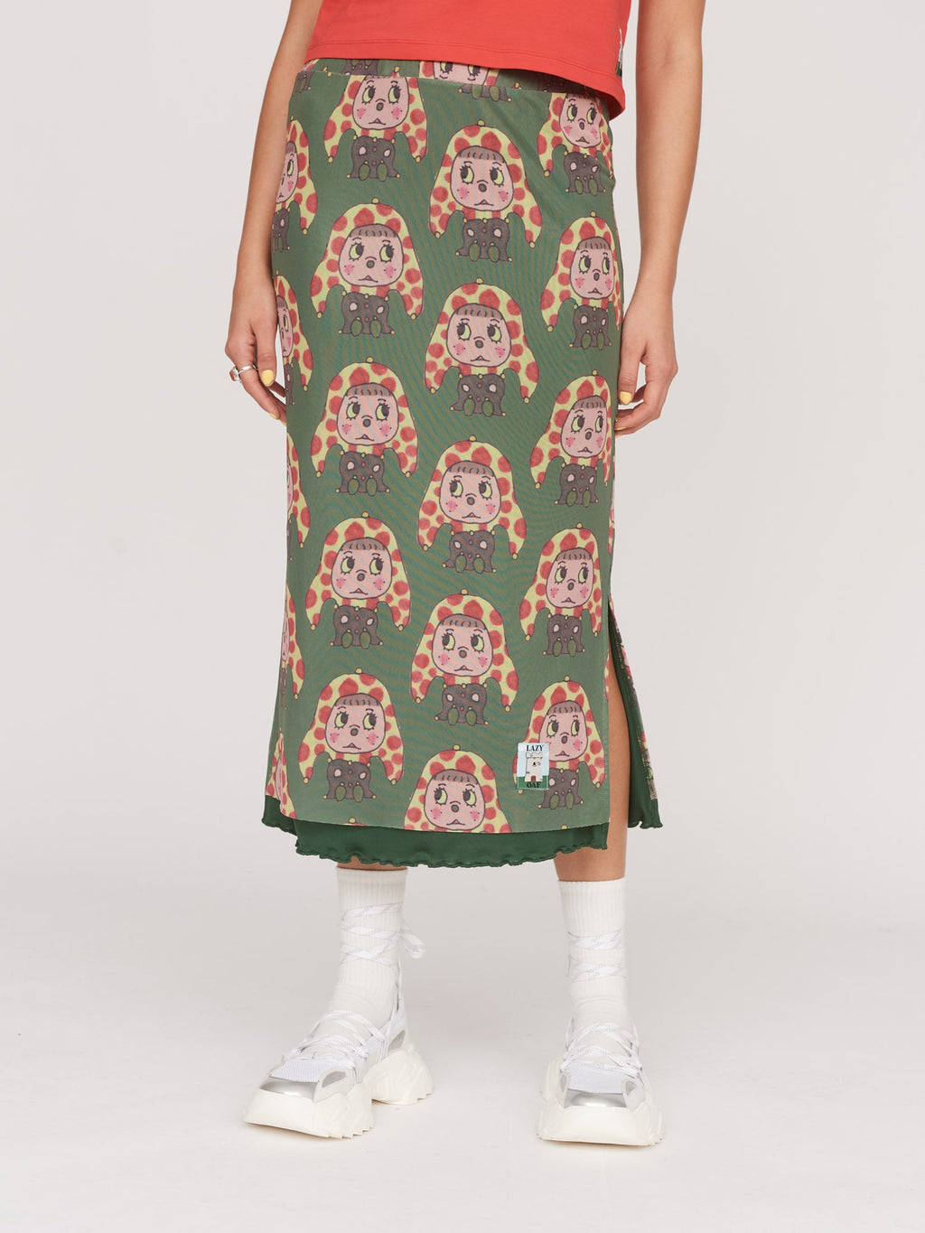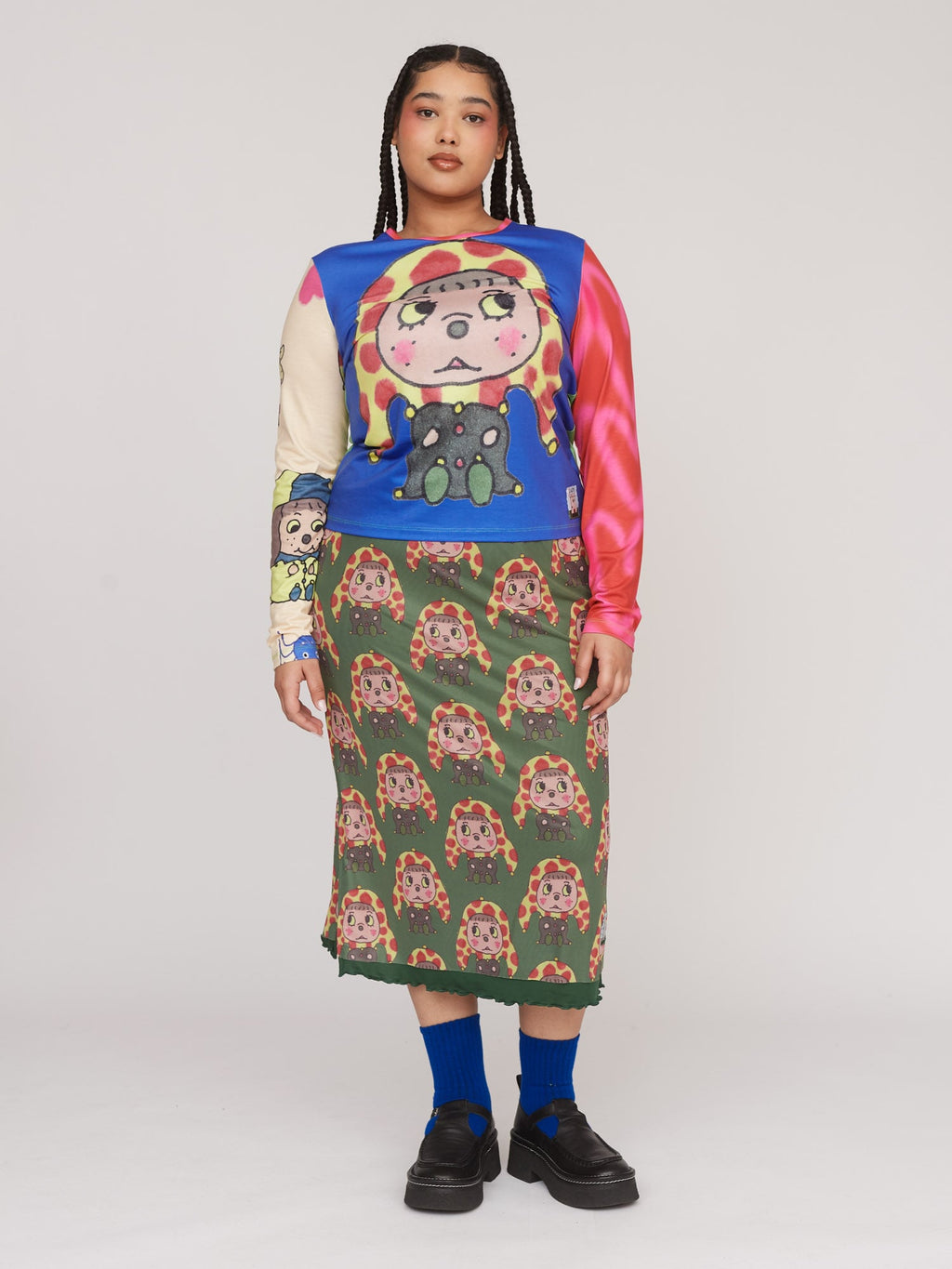 Falling at midi length, this mesh skirt is the perfect piece for looking put together, but feeling super comfy. Across the garment is an all over digital print featuring a jester character drawn by illustrator Tom Jones, @tomjones92_. No need to worry about feeling like everyone can see your pants, as there’s a dark green lining that finishes with a lettuce edge hem. There are side seam splits, along with an elastic waistband, adding to the ease.
