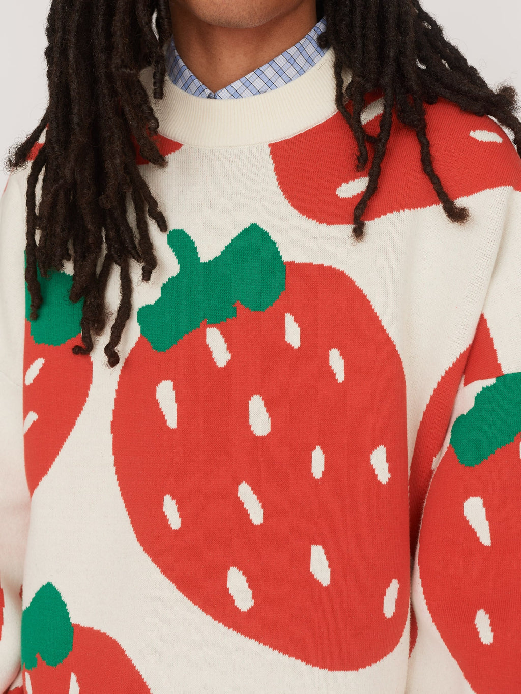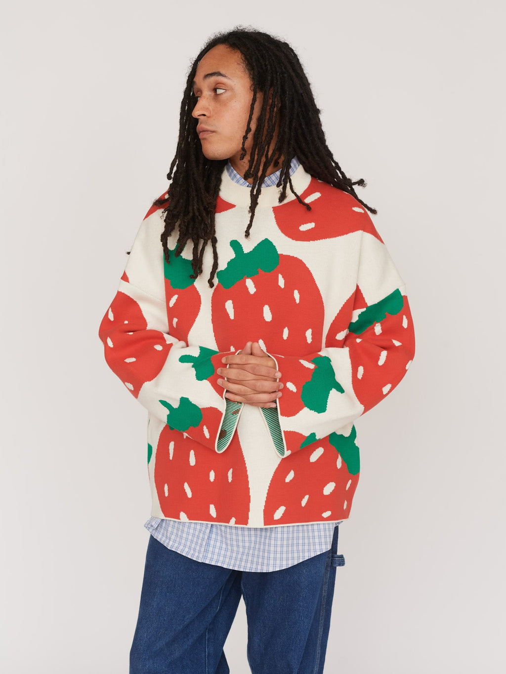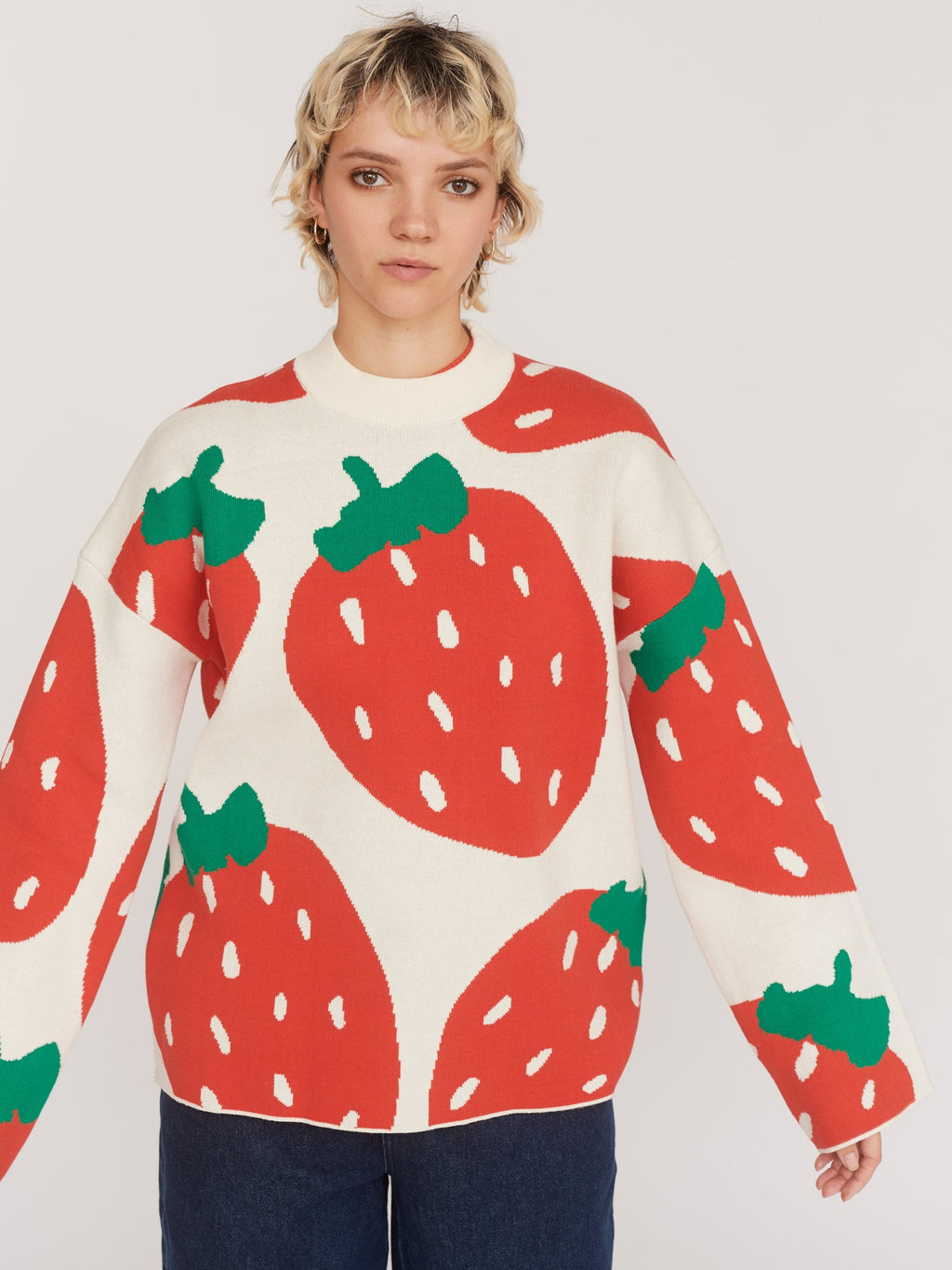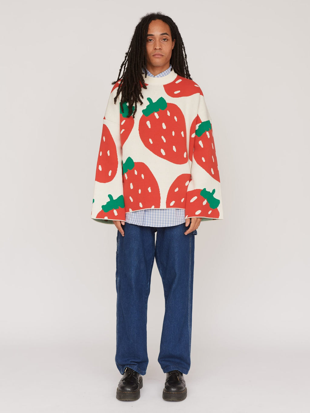 This cotton blend jumper has a relaxed, oversized fit with dropped shoulders, and wide sleeves. Ribbed at the neck, it is in an off-white colour with an all over intarsia strawberry knit design. Strawberry shortcake, eat your heart out