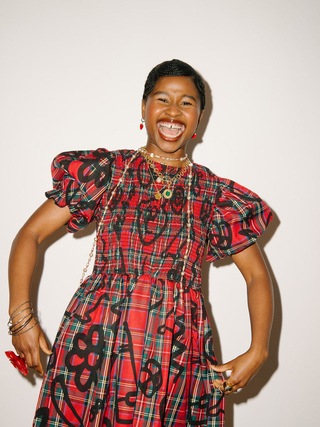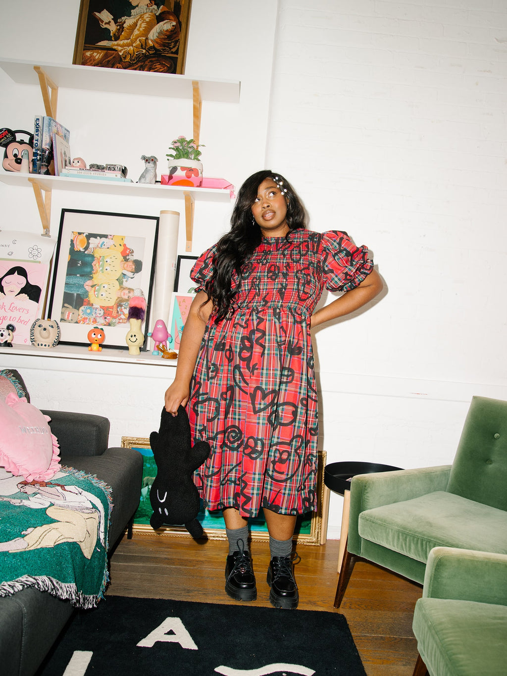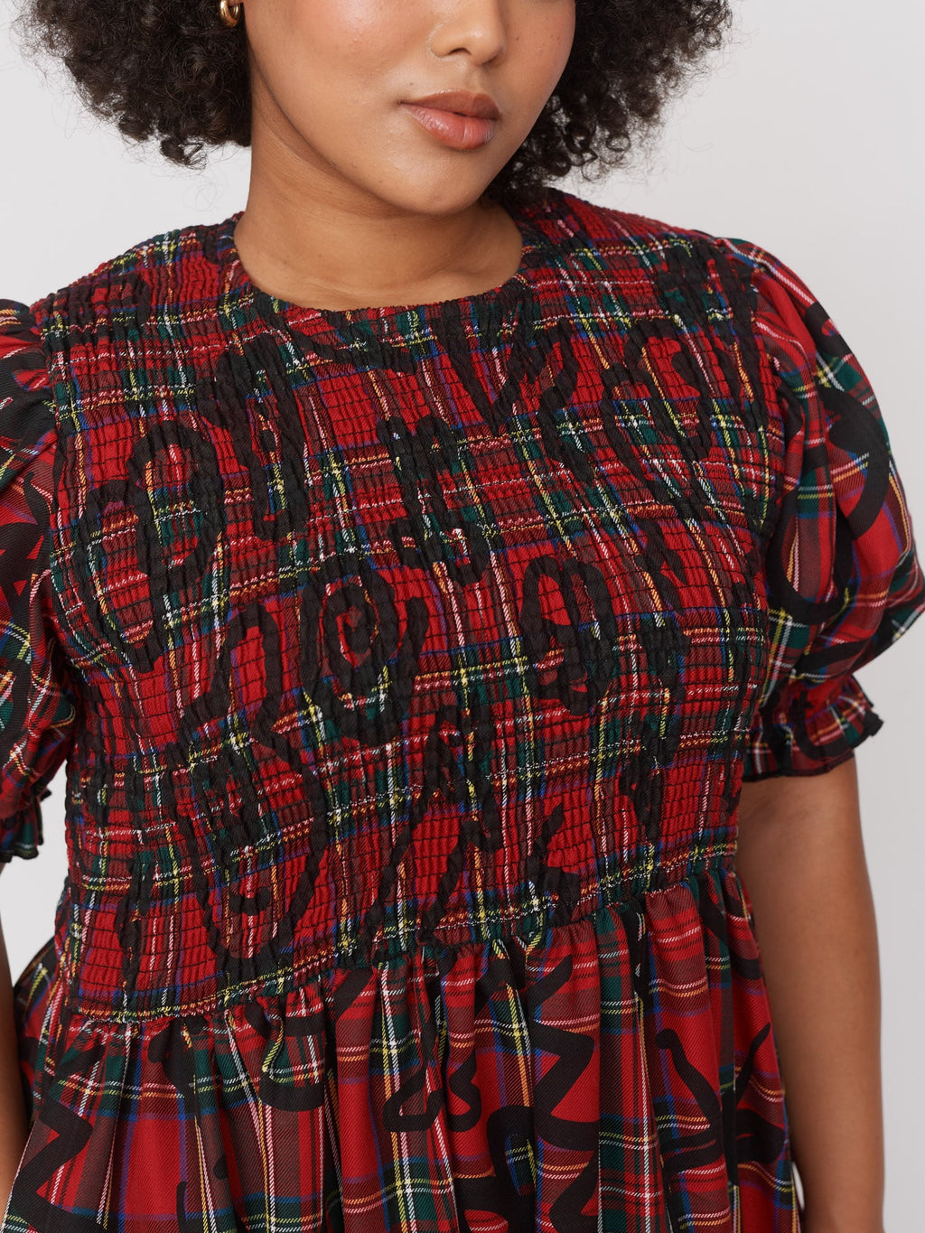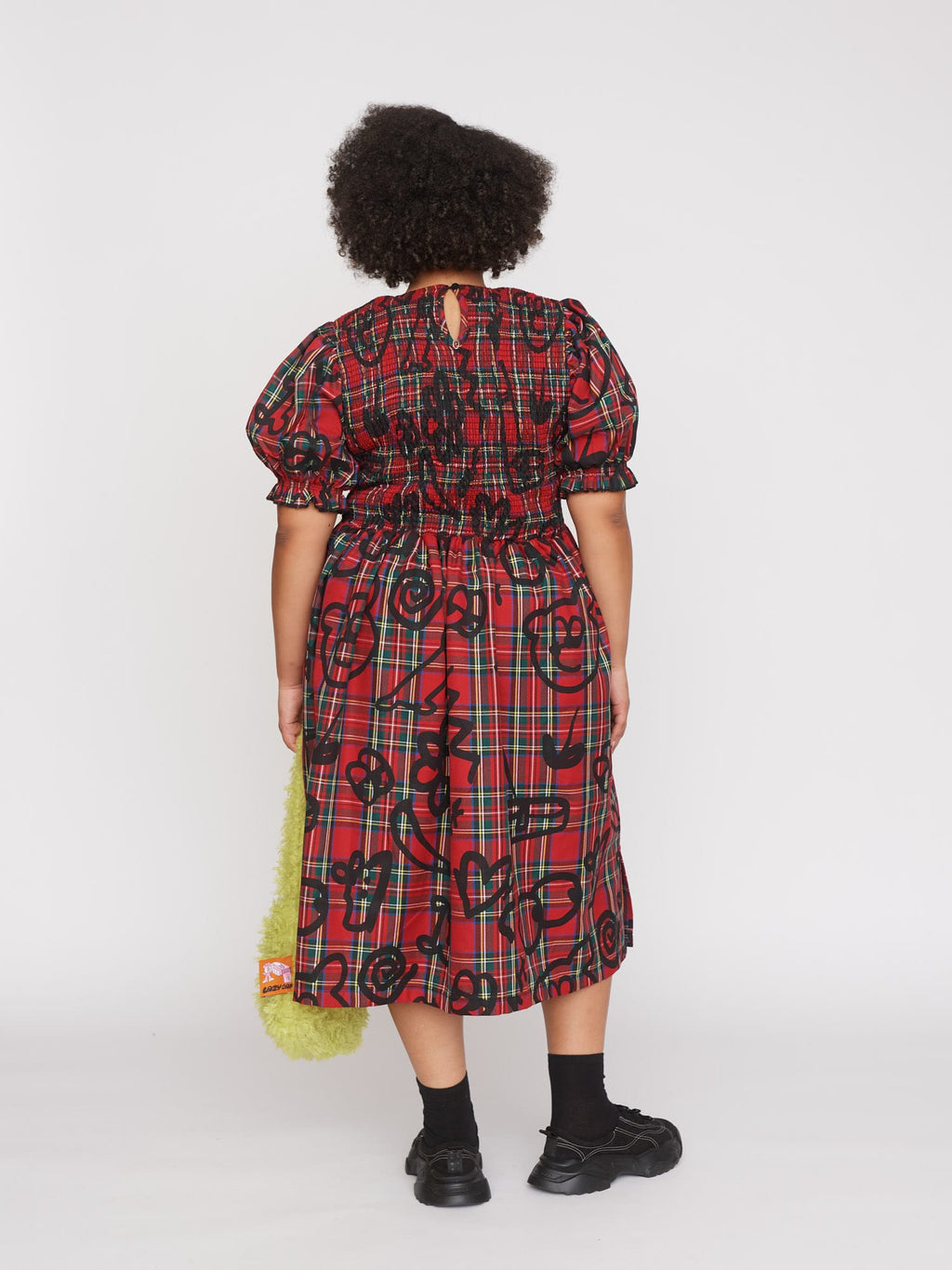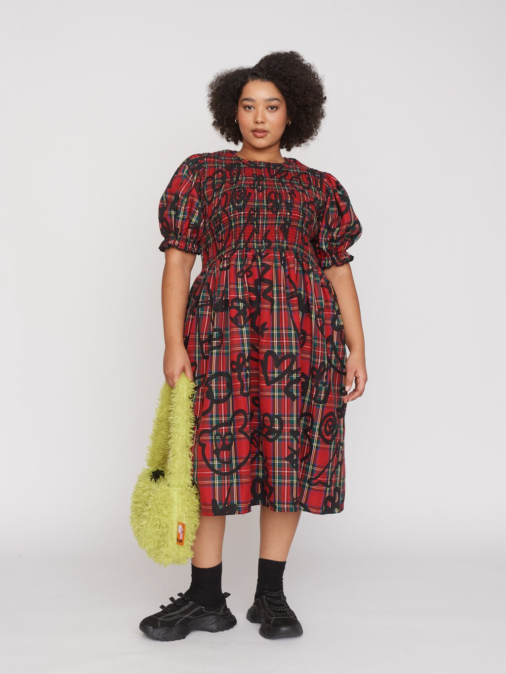 This midi length dress has a shirred bodice that goes into a full skirt, and puffed sleeves with elasticated ruffle cuffs. It’s fastened by a back neck keyhole button closure and yes, it does have side seam pockets. This limited edition dress is made from a heavyweight tartan fabric and has an all over scribble print in black, which is unique in placement from garment to garment. Layer our Bollocks Lacey Top in black underneath and pair with our Black Ballet Sneakers for a signature Oaf look.