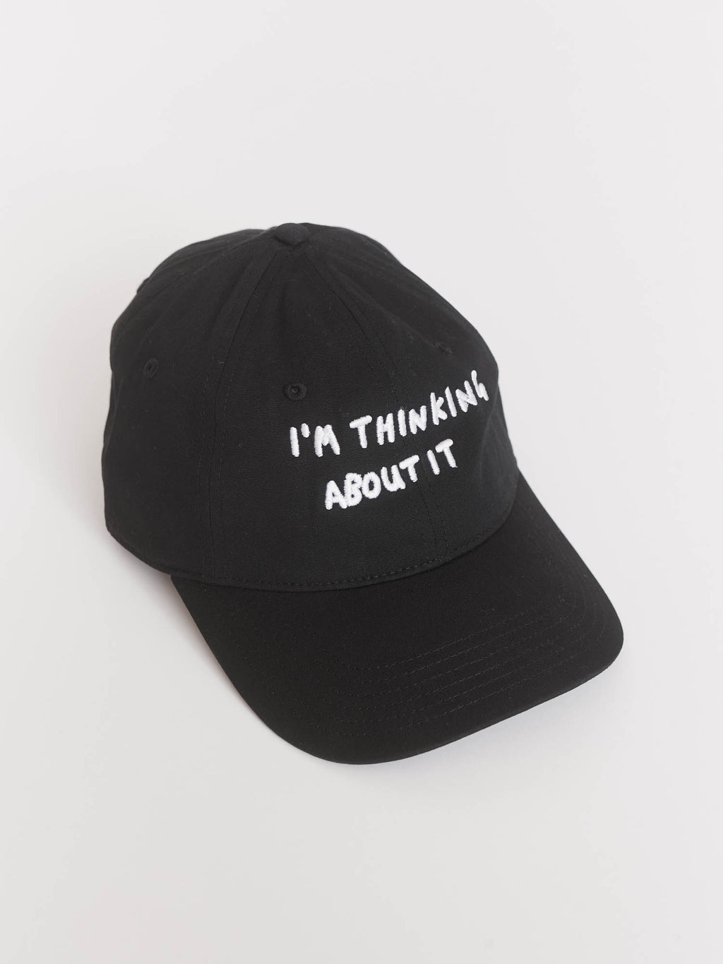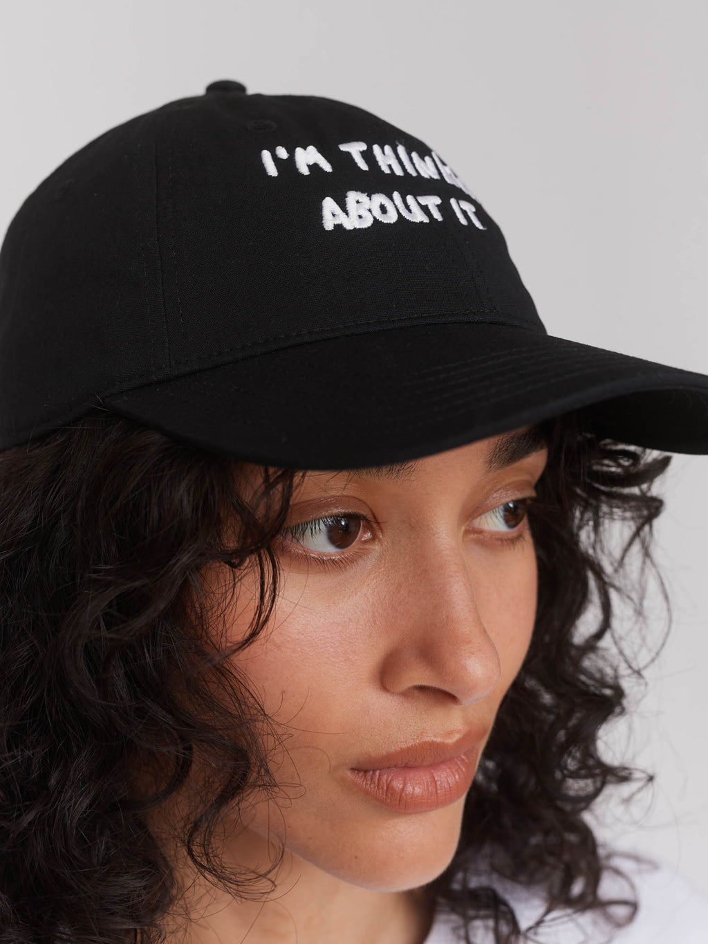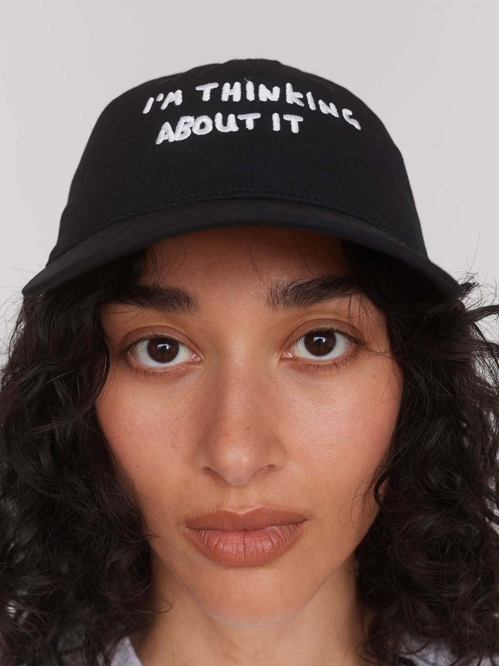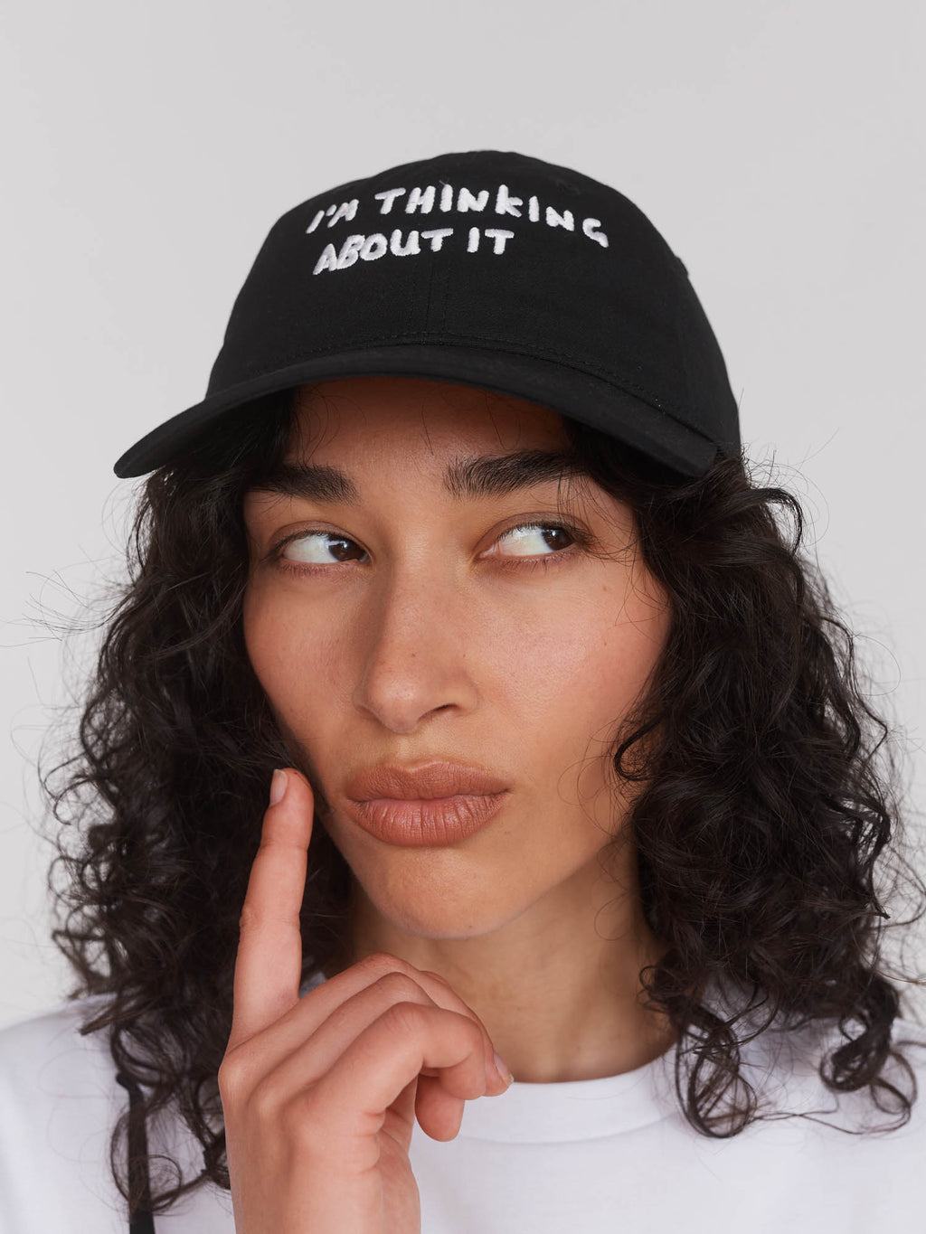 This mid-profile six-panel cap has a curved peak with an adjustable fastener and metal clasp, so you can get the fit just right. In black, it features the text ‘I’m thinking about it’ embroidered onto the front in contrasting white. Made from 100% organic cotton and in partnership with Tate; Are you thinking about your next big art project or what you’re gonna have for tea? The world will never know.