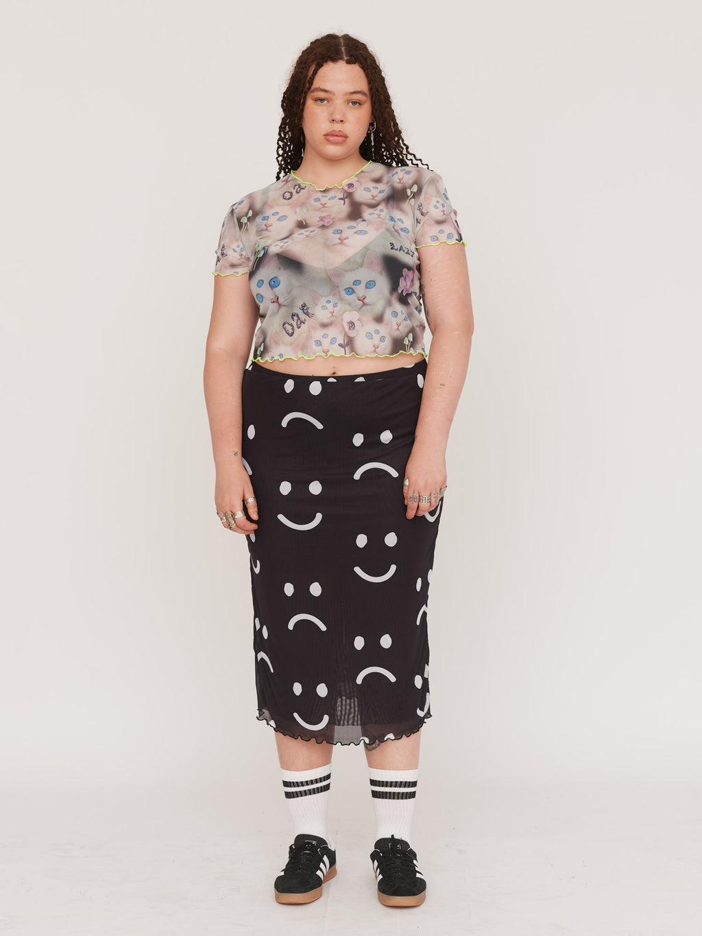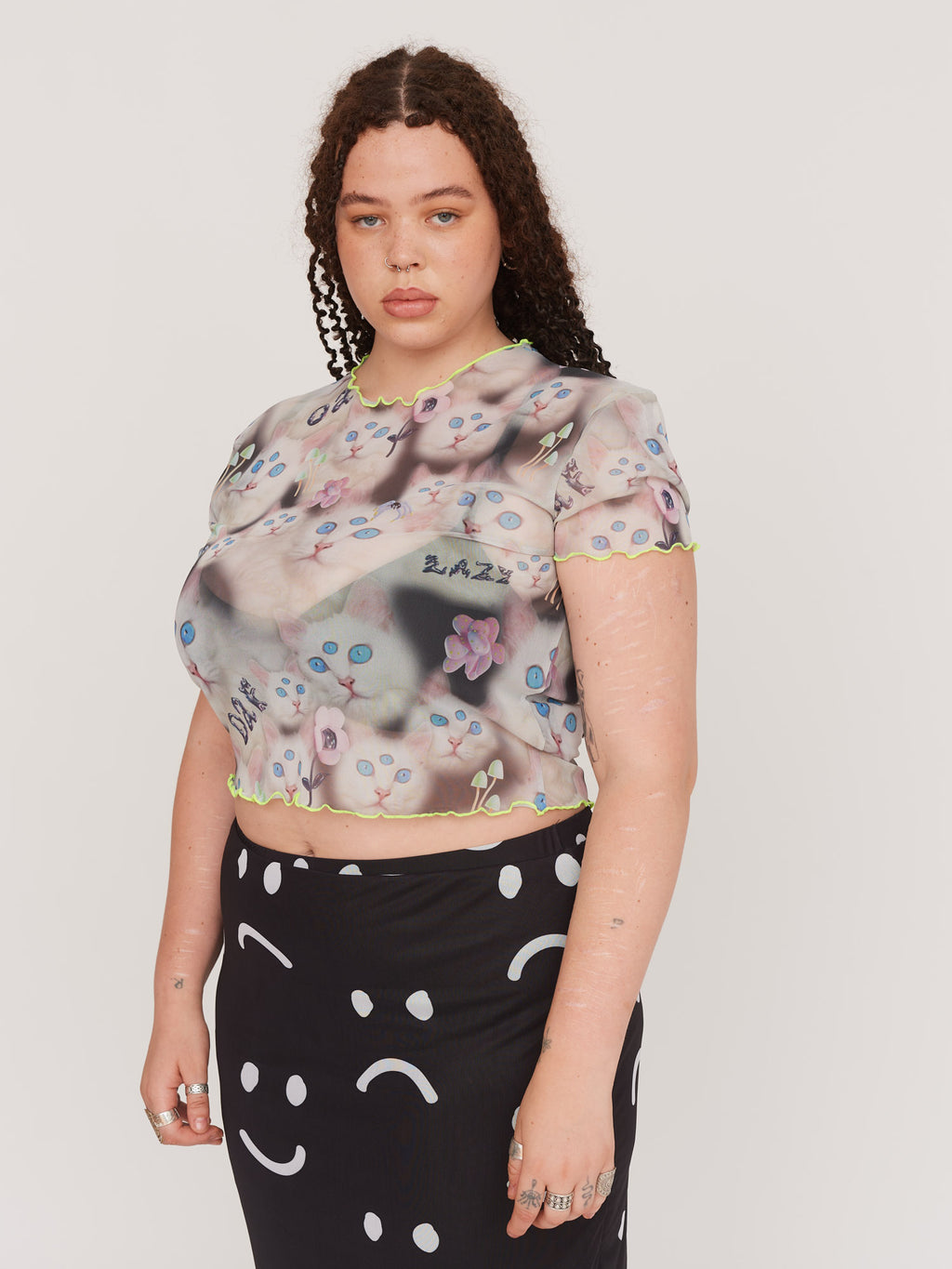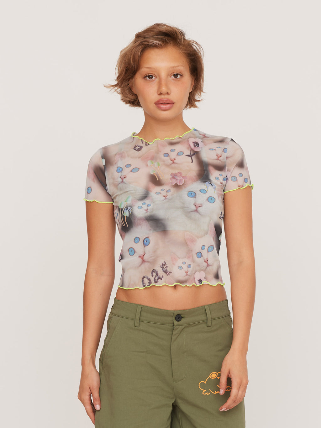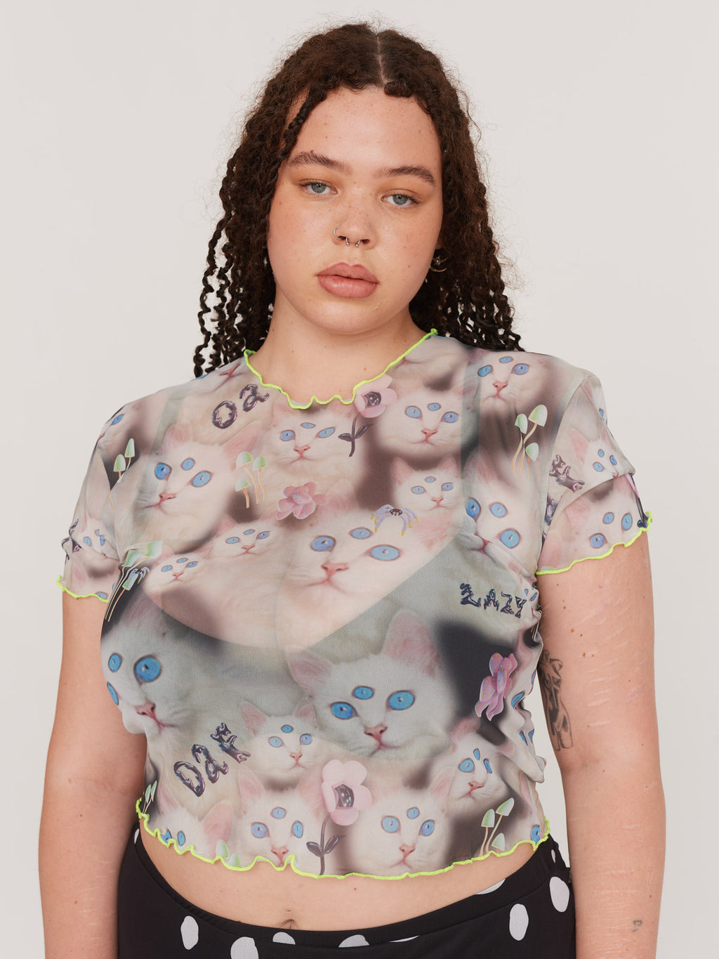 This cropped mesh t-shirt features an all over Lazy Oaf 3-eyed cat print with a fitted silhouette. It has neon lettuce edge hem, cuffs and neckline; wear alone or under a fitted long sleeve top.
