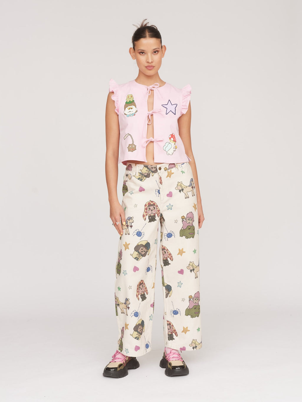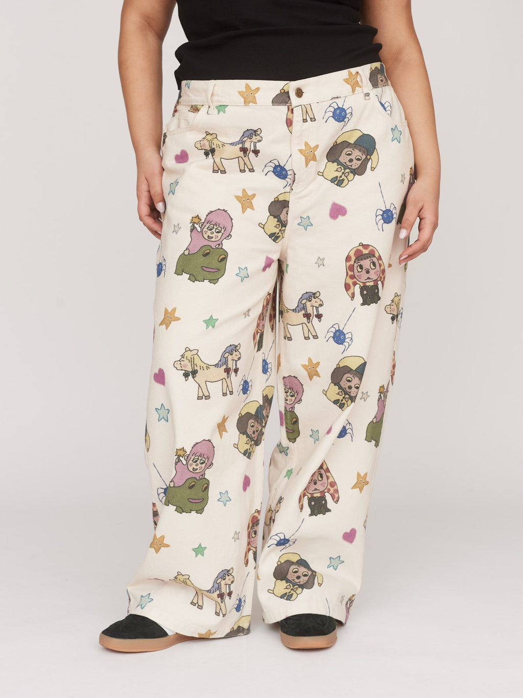 Sitting at mid-rise, they have an elasticated back waistband with a zip fly closure; if you’re in-between sizes we recommend sizing down due to the stretch from the elastic. They have both hip and back patch pockets along with a jacron paper patch on the back of the waistband. Pairing perfectly with the Unhappy Endings Twill Chore Jacket, they have an all over print done by illustrator Tom Jones.