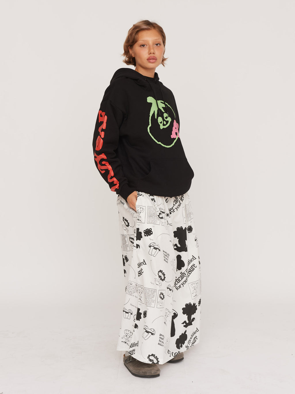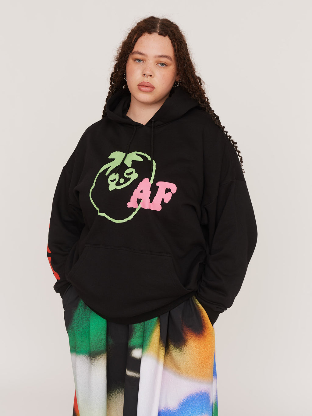 Our classic hoodie shape is oversized, relaxed and is perfect to throw on. It features an Oaf spell out on the front and Lazy Oaf down the right sleeve by Larissa Laban (@larissalaban). This black hoodie is made from an uber cosy 100% brushback cotton, and has ribbed cuffs and hem with a kangaroo pouch.
