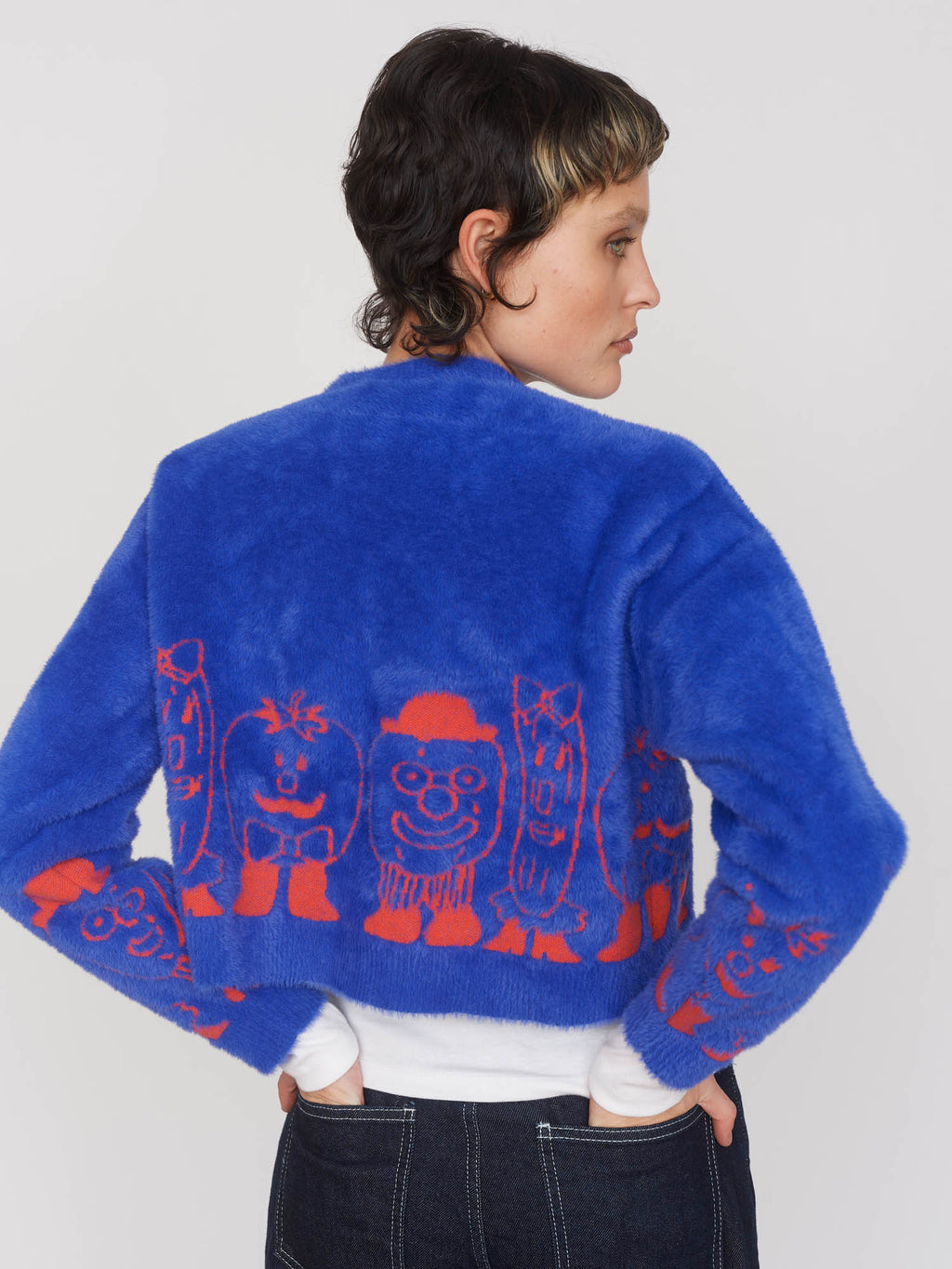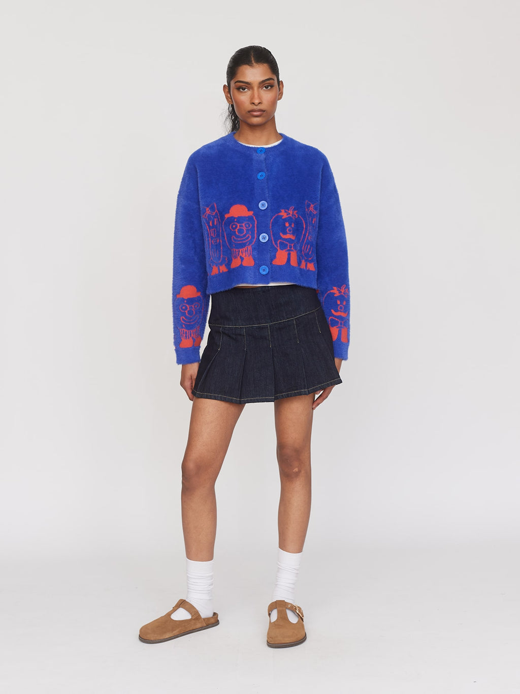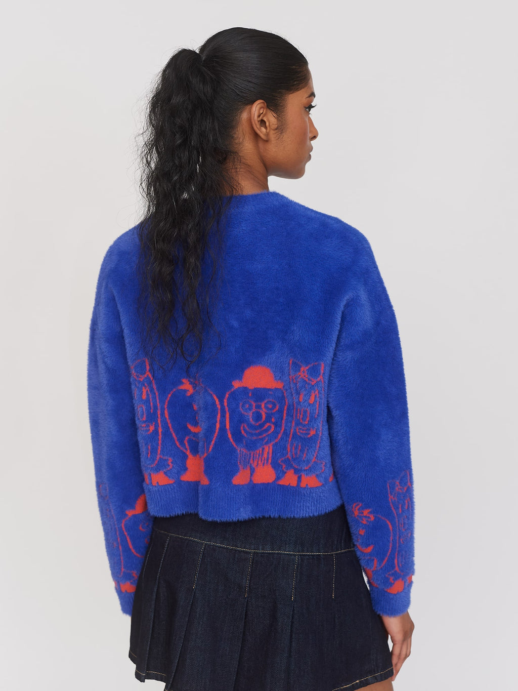 In a fuzzy knit, this cobalt blue cardigan has a boxy fit and is cropped in length with a ribbed neckline, button placket, hem and cuffs. With a dropped shoulder and tonal buttons, the cardigan features a contrasting orange instarsia design by Zoey Kim around the hem. This relaxed fit cardigan will be perfect for staying warm on those cool, spring days.