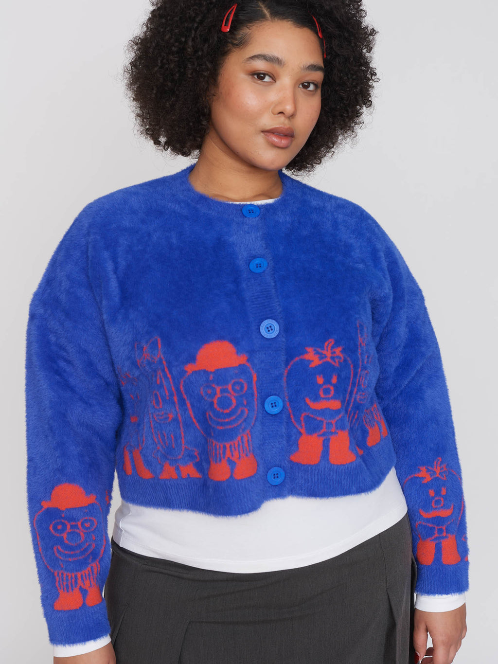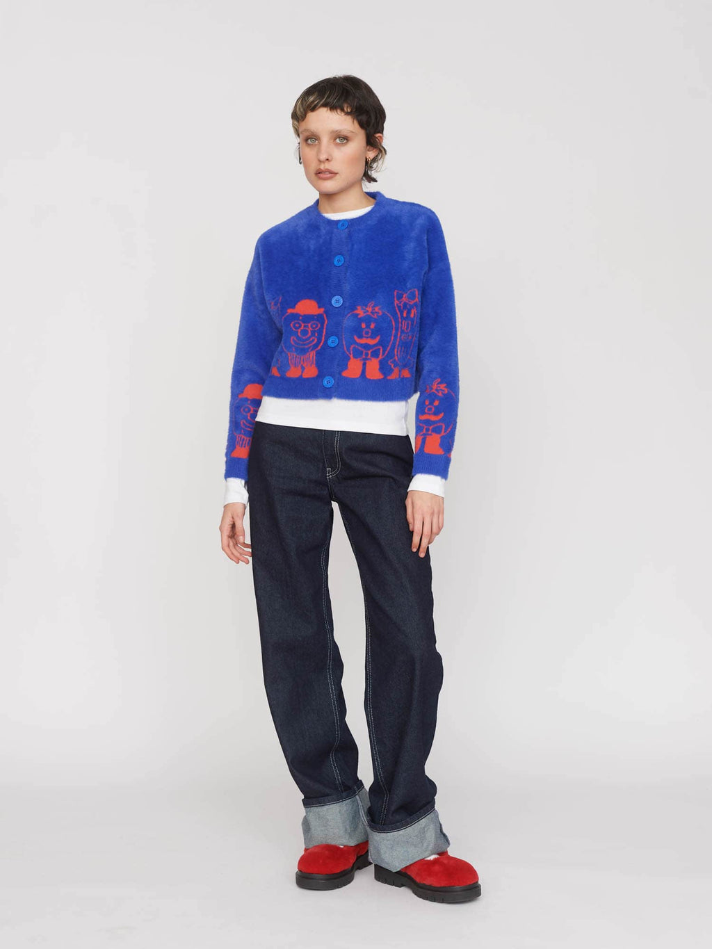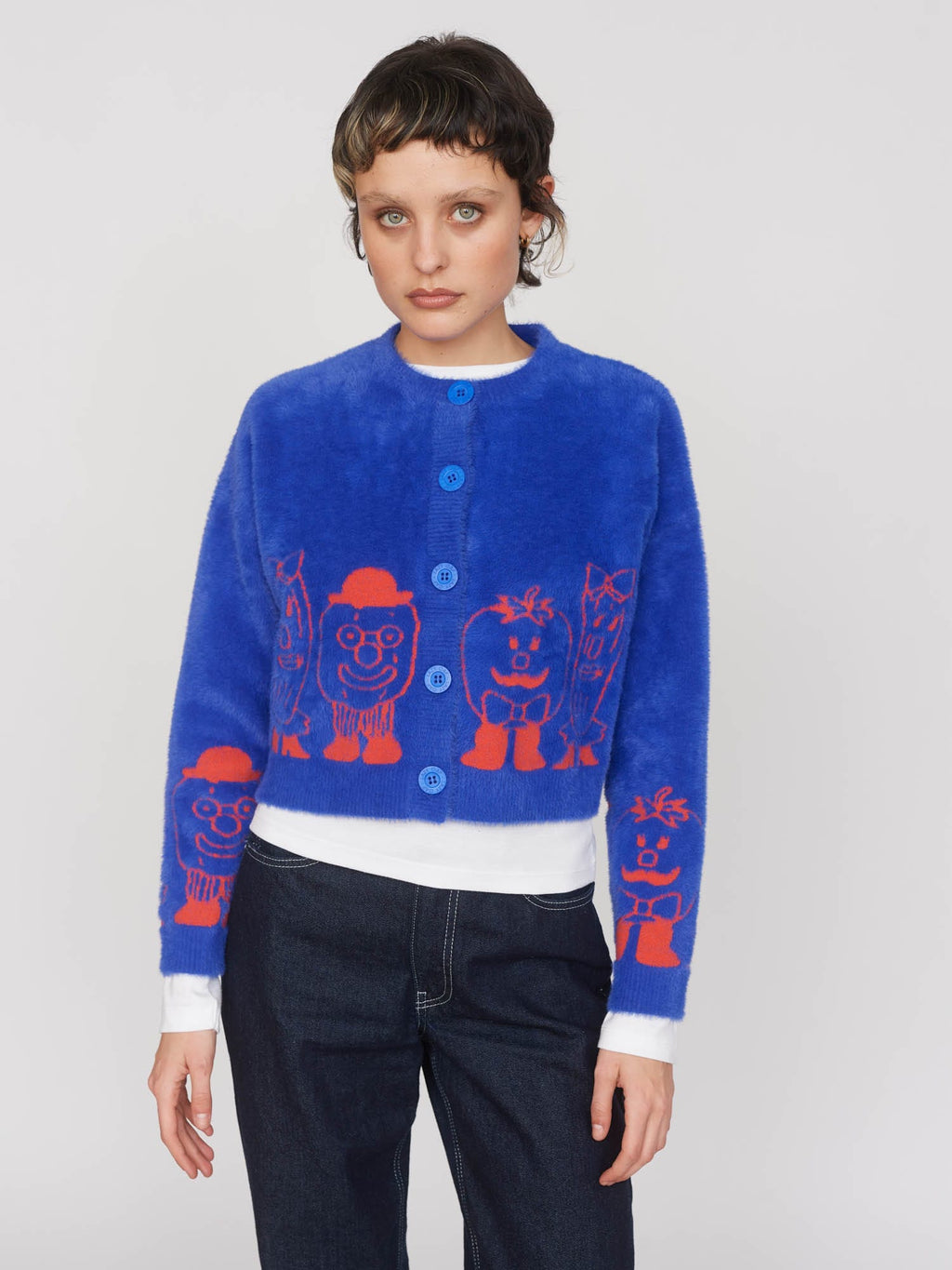 In a fuzzy knit, this cobalt blue cardigan has a boxy fit and is cropped in length with a ribbed neckline, button placket, hem and cuffs. With a dropped shoulder and tonal buttons, the cardigan features a contrasting orange instarsia design by Zoey Kim around the hem. This relaxed fit cardigan will be perfect for staying warm on those cool, spring days.