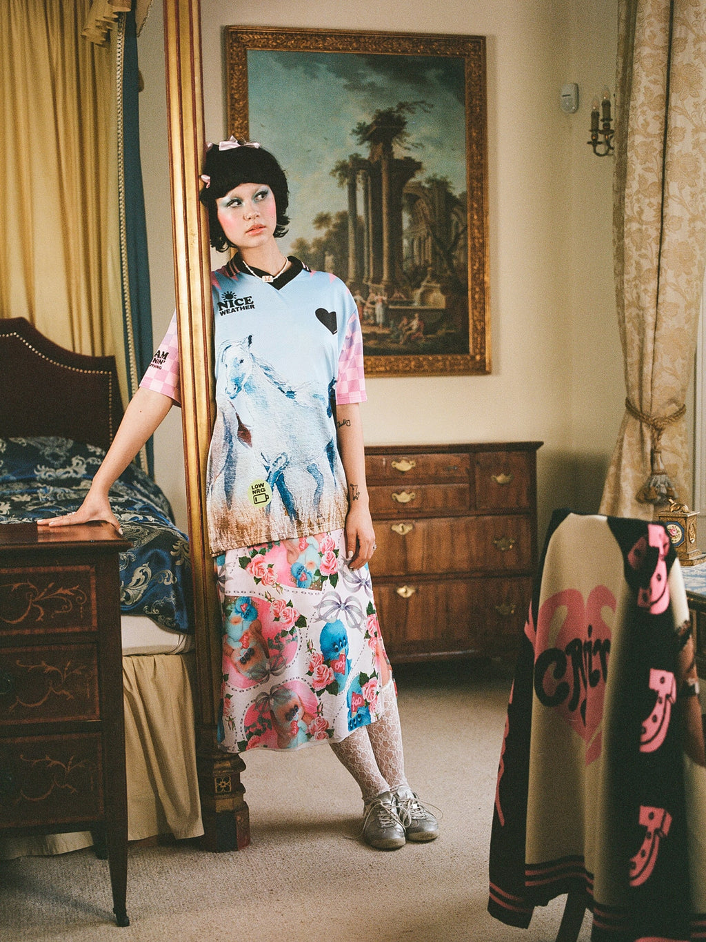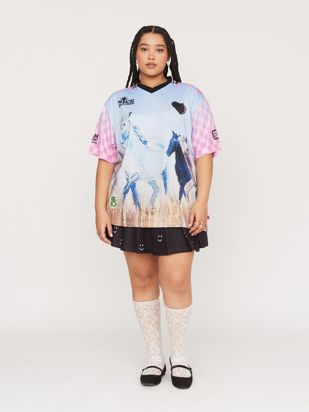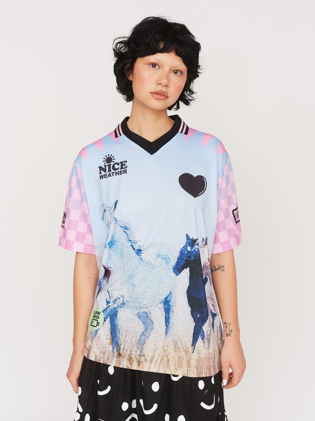 In a football shirt style, this jersey has a relaxed fit with an all over digital graphic featuring a painting by one of Oaf’s very own relatives. It has a contrasting digital print on the sleeves, with a black ribbed collar and pink tipping stripes.