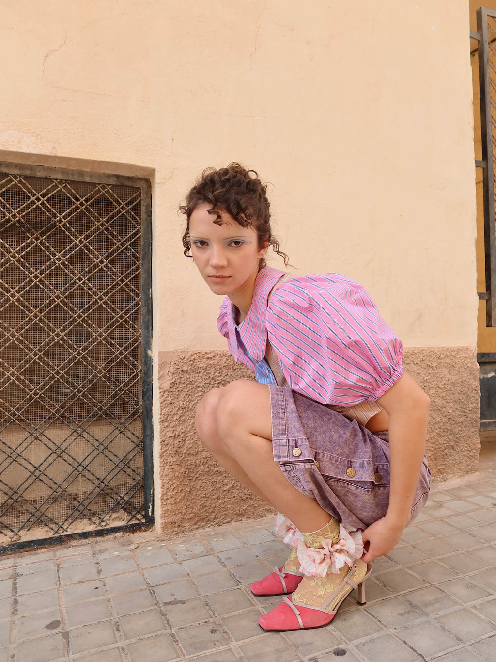 This short sleeve, fitted shirt has an oversized peter pan collar with a curved button placket and asymmetrical hem. In a cotton blend, mismatched stripe fabric, it has puff sleeves with elasticated cuffs so they don’t lose any volume. The button placket features functional, wonky button holes and has faux shell buttons. Style with our Tan Lines Shorts and either flats or heels for a look that’ll be perfect for day or night.